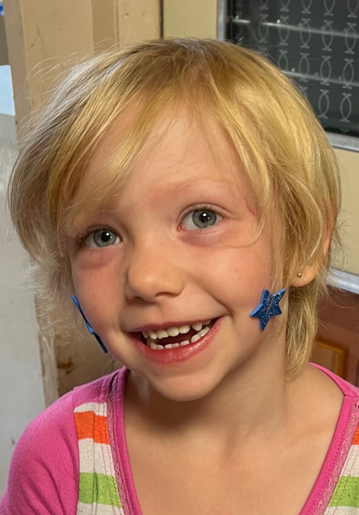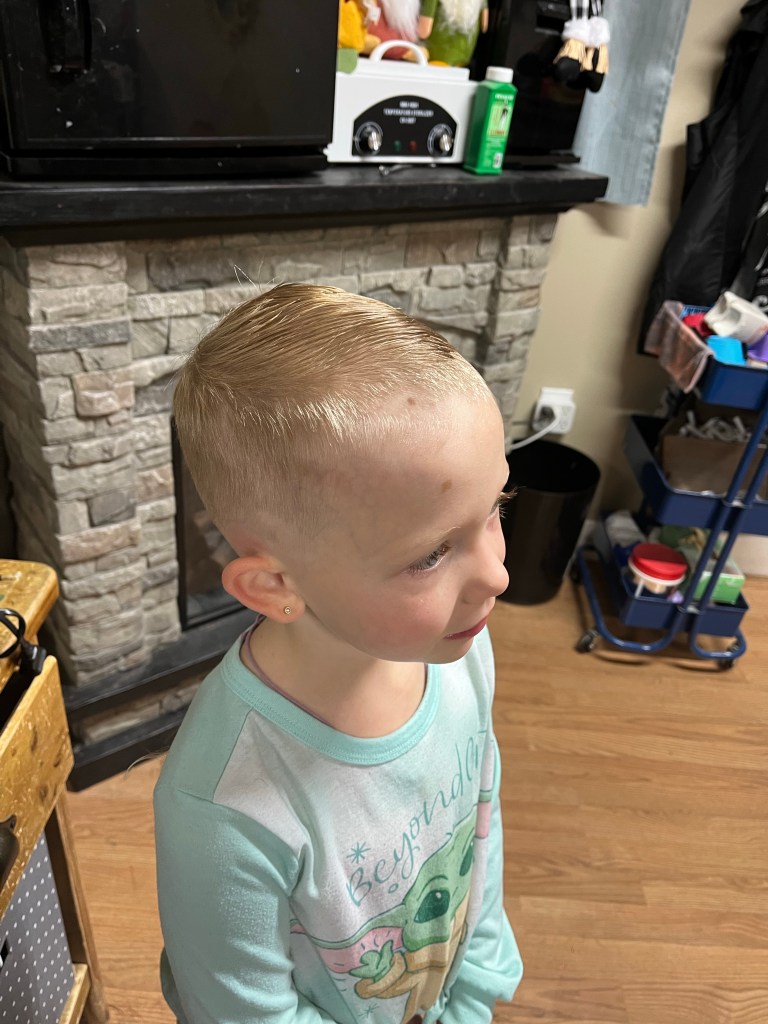 My daughter has been trying for the last few months to grow her hair out fast by using the shampoo and conditioner bar from doterra. It was working quite nicely. That is until last night my oldest son decided to help his four year old sister out by “trimming” her hair. 🤦♀️ Not one of his brighter moments, but a loving jester. I was relaxing in my room She came into the master bathroom and as she was climbing up on the sink I asked her what she was getting. She said “the hair spray”. As I pressed further and asked why she responded “so my (oldest sons name ) can style me hair”. That is when I looked at her. My jaw dropped. I took her back out to the living room to get aid from my husband who was reading in the living room. Where my son cut her hair. He was just as floored when he saw what happened. My son had used the scissors and a dog buzzer to trim her hair.